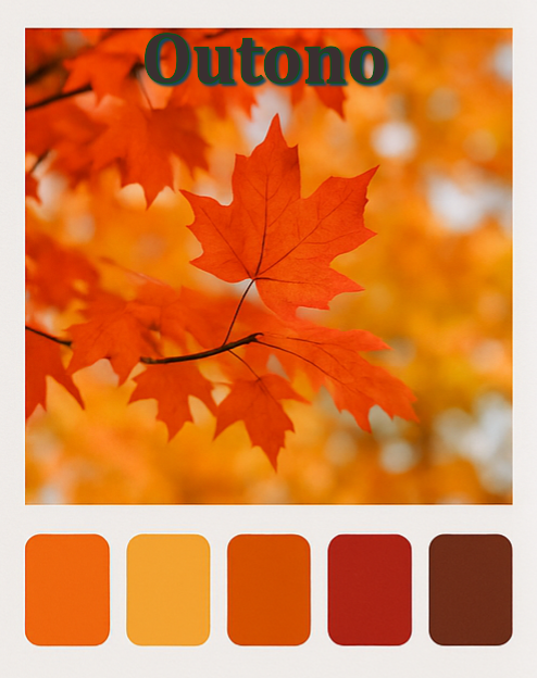 • Tons terrosos: Marrom, ferrugem, mostarda e vinho refletem a mudança das folhas.