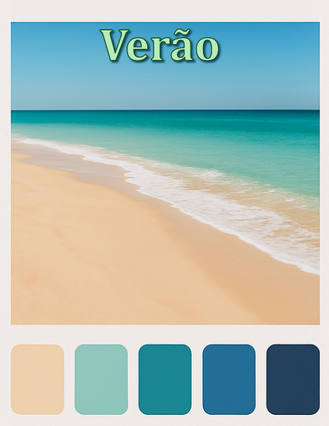 • Cores vibrantes e estampas tropicais: Vermelho, laranja, azul céu e estampas com folhas ou frutas.